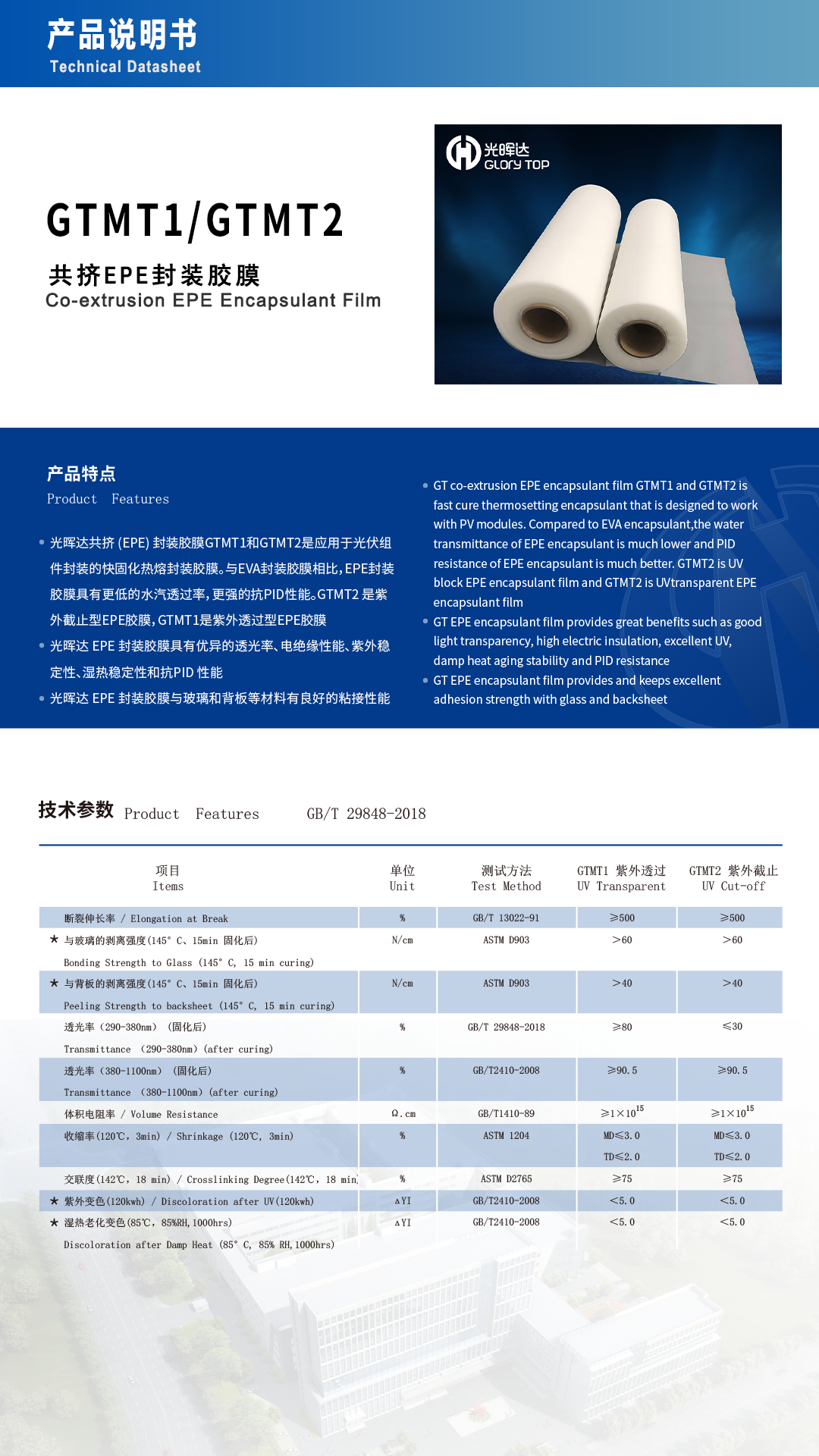共挤(EPE)封装胶膜GTMT1和GTMT2是应用于光伏组件封装的快固化热熔封装胶膜。GTMT1是紫外透过型EPE胶膜,GTMT2是紫外截止型EPE胶膜。不仅具备POE低水汽透过率、高电阻率特点,同时拥有EVA高粘结性能。相对于EVA胶膜具备更好的耐老化性能和抗PID性能。层间分布均匀且不分层,粘接强度高,交联度稳定。